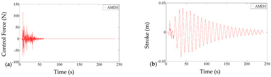 Three cases are considered in this paper: the control systems without time delays, the systems with equal time delays and the systems with unequal time delays. Under the SN direction of the El-Centro seismic wave, the equal time delays are assumed to be 0.05 s (), and the time-delay difference is set as 0.02 s, which means that and . Table 2 shows the acceleration control effects, and the control parameters are shown in Figure 3, Figure 4, Figure 5, Figure 6, Figure 7 and Figure 8. The ratio between the reduction of structural responses and the responses without control is defines as Control effect. The control forces and strokes constitute AMD parameters.