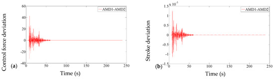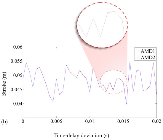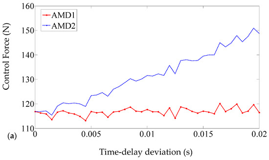 To analyze the impact of the time-delay differences on different systems, the time delay difference is increased from 0 to 0.02 s, and the corresponding maximum strokes and maximum control forces of System2 are plotted in Figure 9. As the time-delay differences increase, for the AMD-1, the amplitude of the control forces become larger while the amplitude of the strokes remains stable, which is consistent with the previous results.