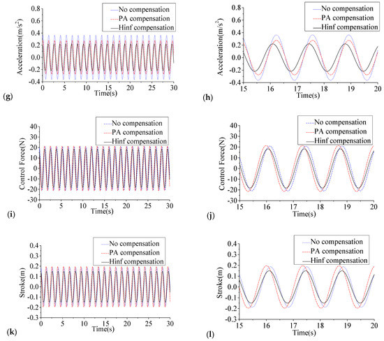 The structural responses and the control parameters of the experiment under the numerical results, the displacements (a) 0–30 s and (b) 15–20 s and the accelerations (c) 0–30 s and (d) 15–20 s of the 2nd floor, the displacements (e) 0–30 s and (f) 15–20 s and the accelerations (g) 0–30 s and (h) 15–20 s of the 4th floor, the forces (i) 0–30 s and (j) 15–20 s and the strokes (k) 0–30 s and (l) 15–20 s.
