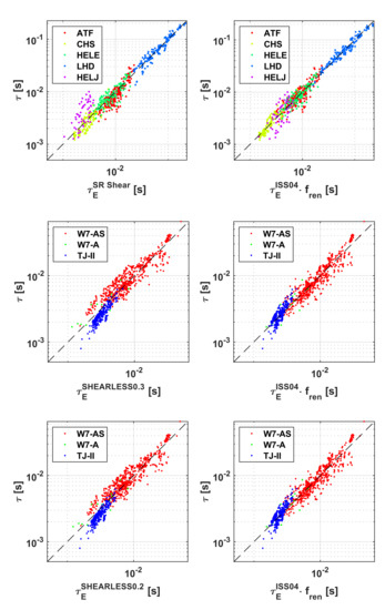 Another delicate issue affecting the DB relates to the rotational transform. Indeed, it proves quite problematic to extract the dependence of τE on the rotational transform from the DB. This is mainly the unfortunate consequence of two factors: the design of certain devices and the experimental programme of others. The heliotron/torsatron family of devices, due to engineering constraints, presents a very strong collinearity between the rotational transformand the aspect ratio. In their turn, W7-A and W7-AS machines do not scan a significant range of . Consequently, it is difficult to isolate the effect of the rotational transform on τE. To alleviate this deficiency, an approach, similar to the one devised in [22] to obtain ISS04, has also been implemented to derive the scalings reported in this work. TJ-II dependence of τE on the rotational transform is used as first guess for symbolic regression. This approach works quite well for the devices with shear, whose scaling shows a power law dependence on with an exponent not much different from the one of TJ-II. On the other hand, for the shearless configurations much weaker dependencies on would be better supported by the International Stellarator Confinement Database, a subject discussed more extensively in the next section.