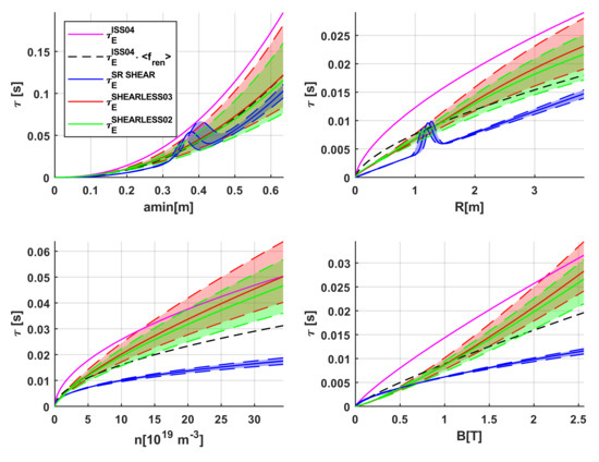 The traditional log–log plots of the experimental energy confinement time versus the predictions of the various scaling laws are reported in Figure 1. They show a graphical comparison of the configurations with shear and without shear. Some trends of the ISS04 and the three scalings obtained with SR via GP are reported in Figure 2 over the parameters interval covered by the machines in the database. The scaling of the machines with shear seems to have a different dependence on the main engineering quantities than the shearless one. A significant difference in the exponents of the power law part of the scalings is particularly evident for magnetic field, plasma density, and major radius. On the other hand, great caution is indispensable in interpreting these visual representations of the equations. Indeed, for clarity’s sake, in these plots, only one parameter is scanned at the time, keeping all the others fixed at the value corresponding to their average in the database.