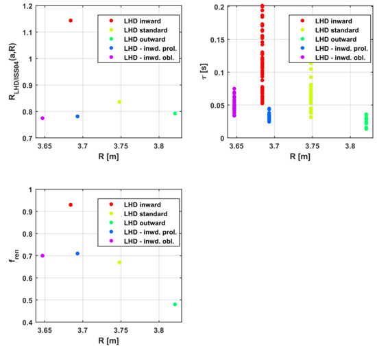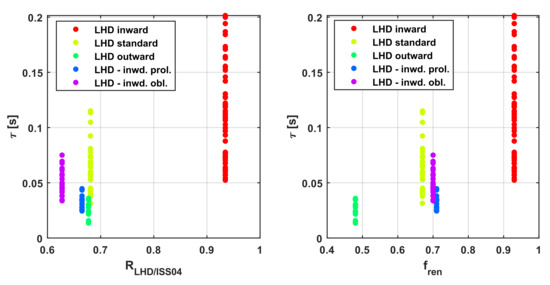 In the case of the shearless device W7-AS, the ratio RW7-AS/ISS04 depends strongly on plasma density and magnetic field, whereas in the case of LHD, the most important factors are geometrical, the minor and major radii. This evidence needs to be further investigated, but some points can be already emphasised. First, the completely different trends of RLHD/ISS04 and RW7-AS/ISS04 stress again the need for particularising the scaling laws for the different magnetic configurations, with and without shear. Second, the dubious and confusing nature of fren becomes even more evident. This arbitrary factor tends to obscure more than clarify the underlying trends and the phenomenology. On the other hand, a significant effort should be devoted to understanding the causes of the different forms of Equations (5) and (6), for example, by studying whether they are due to dissimilar approaches to optimisation or to intrinsic specificities of the magnetic configuration physics.