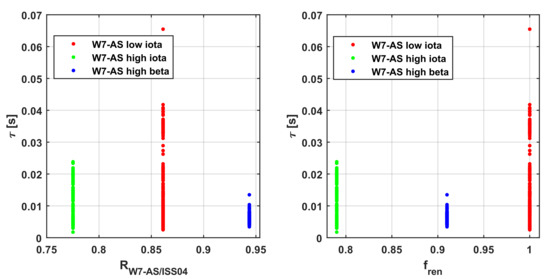 The same analysis reported in the previous subsection has also been performed for the other device, W7-AS, whose entries in the database present a significantly different level of optimisation. In the bottom plots of Figure 3, the trend of the energy confinement time is plotted versus the ratio RW-AS/ISS04. For a exponent of 0.3, the functional dependence of RW-AS/ISS04 is
