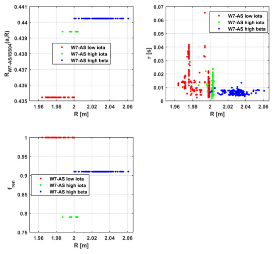 The dependency does not change dramatically for the case of being elevated to 0.2. The ratio RW-AS/ISS04 is compared with fren in Figure 3. The part depending on the minor and major radii, RW7-AS/ISS04(a,R), is shown versus R in the plots of Figure 5 (while the other major dependencies are reported in Figure A3, Figure A4, Figure A5 and Figure A6). Again, for an easier visual comparison, the values of this ratio have been averaged for each level of optimisation.