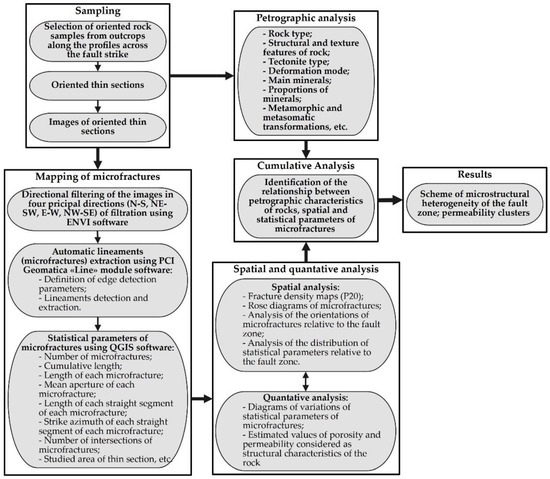 The research methodology is aimed at identifying the heterogeneity of the fault zone based on the analysis of the spatial distribution of microfracture parameters. The main emphasis is conducted on a detailed description of the developed automatic identification and mapping of microfractures. Figure 1 shows a flowchart of the research protocol.