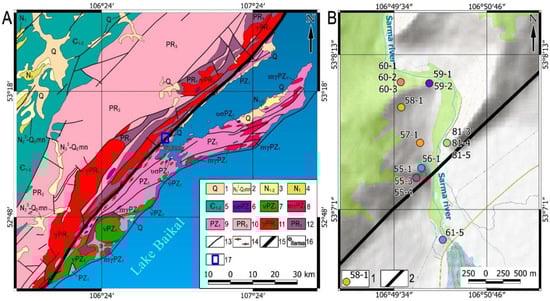 (A) Geological map of the Primorsky Fault [74,75,81,82,83,84]: 1—beach lacustrine deposits of Lake Baikal and alluvium of river valley terraces; 2—Manzurka Fm. alluvium; 3—Golumets Fm. alluvium; 4—Bayanday Fm. alluvium; 5—Lower and Middle Cambrian sediments on the Siberian craton; 6—Atarkhan peridotite–gabbro complex; 7—Ozersk gabbro–diorite complex; 8—Olkhon migmatite–granite complex; 9—Early Paleozoic metamorphic complexes of the Olkhon terrane; 10—Upper Proterozoic sediments (Baikal Group); 11—Primorsky granite complex; 12—Early Proterozoic craton basement; 13—main faults; 14—blastomylonite from the marginal suture of the Siberian craton; 15—Primorsky Fault; 16—Sarma village; 17—area of study. (B) Scheme of the oriented rock samples selection within the Primorsky Fault zone near Sarma village: 1—sampling points and their numbers; 2—Primorsky Fault.