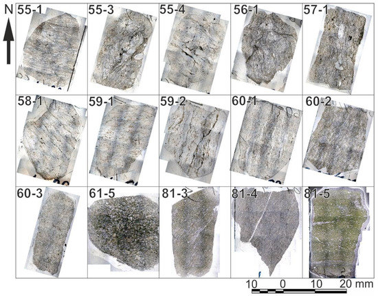 Images of oriented thin sections for microstructural mapping were obtained using an Olympus BX-51 optical microscope with an Olympus Camedia C7070zoom digital camera. To determine the orientation of microfractures in a GIS project and to calculate their geometric parameters (strike azimuth, length and aperture), all studied thin sections must be strictly oriented in space. This requirement must also be taken into account when taking photographs of individual parts of an oriented thin section. Separate parts of oriented thin sections were photographed in such a manner that a panoramic image of the entire section could be automatically constructed for them. Images of thin sections should have a resolution sufficient for analysis, which corresponds to at least 10,000 pixels along the smallest side. Photomosaics collected from separate sections should be provided with a scale ruler. Images were saved in TIFF format. Figure 3 shows thumbnail images of the studied thin sections.