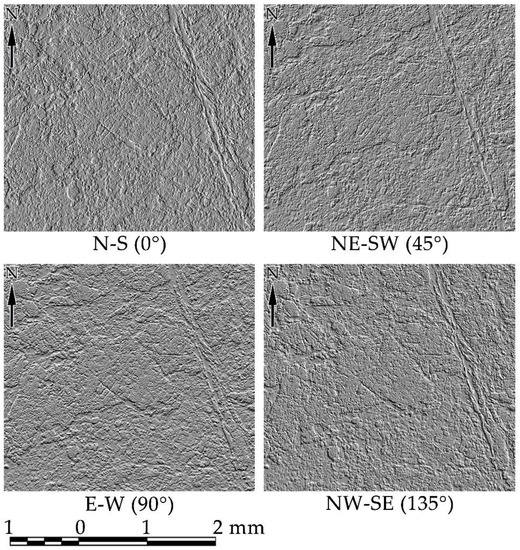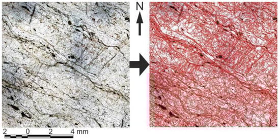 Methods of microstructural analysis always rest on the determination of geometric parameters of all microfractures, for which its number can reach hundreds of thousands in a single-oriented thin section. Obviously, without using any special technique of automatic detection, the solution of this problem is not only technically complex but is also time consuming. Many works present results of successful automatic lineament detection at microscales [27,58,59,60], mesoscales [61,62] and macroscales [61,62,63]. The development of digital technologies allows taking a fresh look at microstructural analyses.