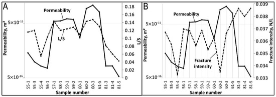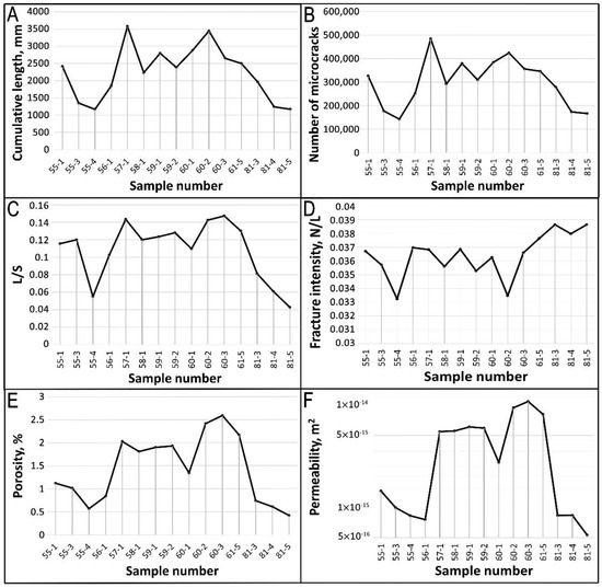 Using the STMA, quantitative parameters of microfractures in thin sections were calculated. The mean length of one object (microfracture segment) was about 7.5 μm. The investigated area varied from 150 to 370 mm2. Microstructural parameters are presented in Table 6 and in Figure 7. Samples 57-1 and 60-2 show maximum cumulative length and maximum number of microfractures (see Table 6 and Figure 7A,B). Minimal values of these parameters are observed in samples 55-3, 55-4, 81-4 and 81-5. The remaining samples are characterized by average values. The L/S ratios (see Table 6 and Figure 7C) reached maxima in samples 57-1, 60-2, 60-3, 61-5 and minima in samples 55-4, 81-3, 81-4, 81-5. Maximum values of the fracture intensity (F = N/L) [99] were observed in samples 61-5, 81-3, 81-4, 81-5 and the minimum values–in samples 55-4, 60-2 (see Table 6 and Figure 7D). In general, the distribution of the fracture intensity is extremely nonuniform. Porosity and permeability can be most informative parameters for assessing the degree of deformations, since they are directly related to the physical properties of rocks. Porosity and permeability vary in a similar manner (see Table 6 and Figure 7E,F). Four clusters can be distinguished. The first cluster shows increased values of porosity and permeability. It includes samples 60-2, 60-3 and 61-5. The second cluster shows average values of porosity/permeability typical for samples 57-1, 58-1, 59-1 and 59-2. The third cluster includes only sample 60-1 and is associated with below-average values. Minimum values characterize the fourth cluster, which includes samples 55-1, 55-3, 55-4, 56-1, 81-3, 81-4 and 81-5. Figure 8 shows distributions of L/S and N/L versus permeability.