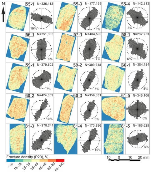 The spatial distribution of microfractures over the area of the section was analyzed by constructing density maps (P20) [95] using the Line Density tool. Rose diagrams of microfractures were built according to the values of their spatial orientation and taking into account their lengths. This allowed the visual assessment of the nature of distribution, the significance and severity of the selected linear objects in the thin section and to compare the intensity of deformations that resulted in the origination of a particular ensemble of microfractures at different stages of tectogenesis. Constructing rose diagrams has made it possible to carry out a comparative analysis of microfracture orientations and to identify different systems and generations of microfractures.