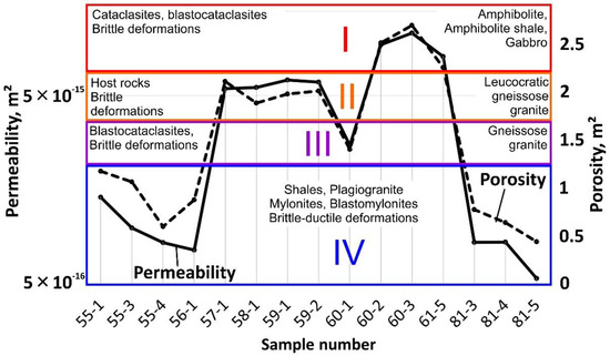 Cracks and microcracks form mainly in the zone of brittle deformations as a response to the external stress [9,30,31,32,33]. Tectonic stresses result in the formation of permeable fractures or cause shear disturbances in pre-existing open fractures [34]. In the shallow crust the brittle deformation is predominant, and the intensity of deformation increases with depth and is relatively independent on temperature, rock type and strain rate [2]. Brittle deformation significantly depends on the coefficient of friction, the pressure of pore fluids and the orientation of the structure relative to the axes of the stress–strain field [33,34]. In contrast, at deep crust, ductile deformation is predominant and is highly dependent on temperature, strain rate and rock type [35]. The temperature increase results in a brittle–ductile transition, and rocks are characterized by brittle properties at low temperatures and acquire ductile characteristics at high temperatures (hundreds of degrees). The brittle–ductile transition usually takes place in the temperature range of 370–400 °C [36,37].