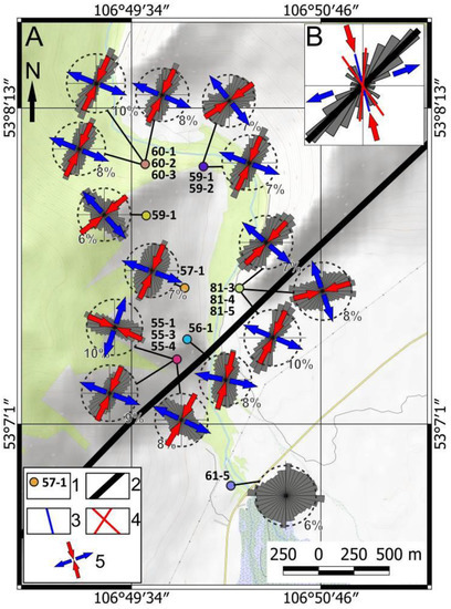 One of the main tasks of tectonophysics and structural geology is to establish the hierarchical rank of tectonic stress fields from local [1,2,3] and subregional [4,5] to regional [6,7,8] and global [9,10,11,12] ones. Depending on the tasks being solved and the scale of the objects under study, various methods from microstructural and petrophysical analyses to numerical methods of continuum mechanics and physical modeling are used [13,14,15]. A reconstruction of the stress–strain field can be successful only after detailed structural studies, mapping smallest changes in tectonic deformations and taking into account the lithological factors and the interaction of structures at different scales [16,17]. Additional information in many cases can decide the interpretation of the obtained data. For example, a comprehensive study of the mechanical, hydraulic and seismological properties of a fault allows the consideration of various components of the fault structure and permits the creation of a most accurate model of the fault [18,19,20]. Actually, the structure of a fault zone being determined provides information forecasting its mechanical behavior [19]. Determining orientation and distribution of microfractures along a large fault helps in verifying the tectonophysical data obtained in macrofracture measurements [21]. Additionally, studying microfractures in oriented rock samples may be used to define paleostress conditions in the rock at the time when the microfractures formed [22,23,24].