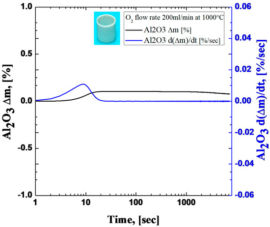 Mass-gain result of the dummy test with alumina tube under 200 mL/min oxygen flow rate condition at 1000 °C.