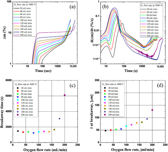 Results of the isothermal oxidation experiments under various oxygen flow rate conditions at 1000 °C: (a) TG mass gain (log–log diagram), (b) TG mass-gain rate (log–log diagram), (c) breakaway time, (d) oxide thickness at the breakaway.