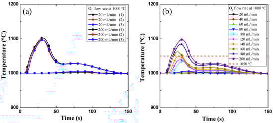 Measurement of the reaction heat was performed by measuring the temperature around the cladding specimen in order to identify the reason for the breakaway time delay. In Figure 4a,b, the history of the temperature escalations during the early stage of the reaction between oxygen and fresh metal in terms of the increasing flow rate are shown. The reproducibility of temperature measurements is very satisfactory when both the lowest and the highest flow rate cases are considered (Figure 4a). Moreover, the peak temperature increases with the increase in the oxygen flow rate due to rise in the oxygen flow rate per the outer surface of the metal [1], as shown in Figure 4b.