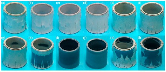 Macrographs of selected Zircaloy-4 after 2 and 4 h isothermal tests under various oxygen flow rate conditions at 1000 °C: (a) 20 mL/min, (b) 40 mL/min, (c) 60 mL/min, (d) 80 mL/min, (e) 100 mL/min, (f) 120 mL/min, (g) 140 mL/min, (h) 160 mL/min, (i) 180 mL/min, (j) 200 mL/min, (k) 180 mL/min, (l) 200 mL/min; (a–j) 2 h, (k,l): 4 h.