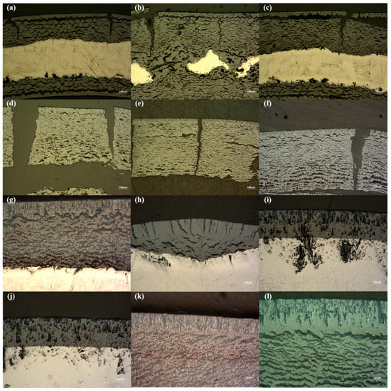 Micrographs of selected Zircaloy-4 after 2 and 4 h isothermal tests under various oxygen flow rate conditions at 1000 °C: (a) 20 mL/min, (b) 40 mL/min, (c) 60 mL/min, (d) 80 mL/min, (e) 100 mL/min, (f) 120 mL/min, (g) 140 mL/min, (h) 160 mL/min, (i) 180 mL/min, (j) 200 mL/min, (k) 180 mL/min, (l) 200 mL/min; (a–j): 2 h, (k,l): 4 h.