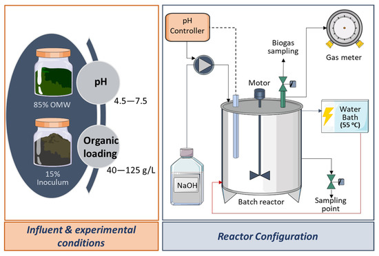 The OMW, which was used for the batch tests, originated from a three-phase olive mill, located in Patras (Achaia, Greece). The substrate was promptly stored under −18 °C in the freezer in order to avoid any significant change on its physicochemical characteristics. For runs A–E (Table 2), the OMW was diluted with tap water in a ratio of 1:2 (one part OMW and two parts tap water); for run G, the respective ratio was 1:0.6 (organic loading doubling); and for run F, no dilution was needed. The physicochemical characteristics of the substrate without any prior dilution is presented in Table 4. The amount of the substrate was set in each run as the 85% (v/v) of the reactor’s working volume.