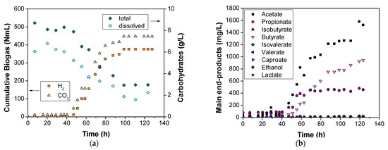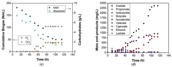 Concerning the other metabolites’ evolution, a simultaneous increase in acetate, ethanol, and butyrate was also presented during the second day. Due to the specific three produced metabolites, all the fermentation types that followed are characterized as H2-producing (acetate, ethanol and butyrate metabolic pathways) [47]. In Mugnai et al. [21], during the third day of their experimentation period, where H2 was detected, a completely different metabolites profile was observed. Even if acetate was still the dominant fermentation metabolite, lactate and formate were also produced, and butyrate was totally absent and appeared after the fifth day of their experiment. Despite the fact that lactate formation was significant in their work, this metabolite can be characterized as an intermediate product due to the fact that, during the eighth day of their experiment, lactate was totally converted to butyrate. In our study, lactate was also formed as an intermediate product (at a maximum concentration of 100 mg/L), as it was totally consumed during the 40th hour of the test.