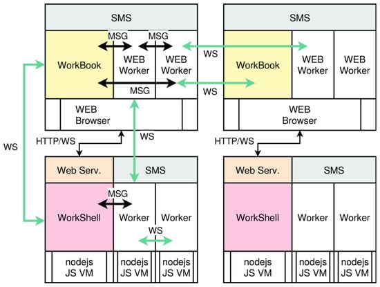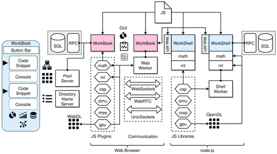 The entire framework, as well as the user code, is programmed entirely in JavaScript, ensuring high portability. Additionally, there is a web WorkShell component providing a web-based WorkShell (with a terminal console) for web browsers, extended with a sub-set of the WorkBook and common libraries. The Web WorkShell (WWS) can be integrated into any web page. The WWS can be configured by URL parameters, including script loading. It is mainly used for participative crowd computing. Finally, the interconnectivity of computational processes among the Internet is provided by a pool and proxy server via WebSocket communication.