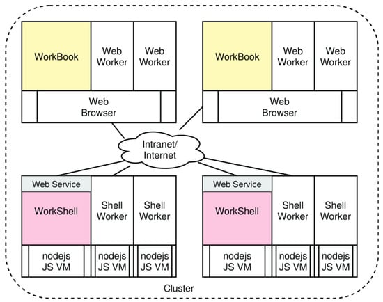 The cluster approach: heterogeneous processing architecture with web browsers (WorkBook) and node.js (WorkShell), connected via the intra- and internet. Parallel execution is provided by spawned WebWorker and ShellWorker.