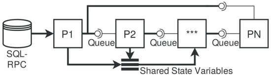 The horizontal sub-task data dependency in the functional chain prevents parallel processing of these computational processes, which are associated with the functions. However, chained data processing systems can be executed by a pipeline approach that executes the computational processes in parallel with different chained data, i.e., there is a parallel process system Par({pi}i=1,n) = p1 || p2 || … || pn with a set of inter-process synchronization using channels c connecting the processes C = {ci:pi → pj}i=1,m. This approach requires an ordered data set sequence D = {d(i)} and is only applicable to data streams (otherwise, no efficient utilization of the different processors can be achieved). Both vertical, as well as horizontal, pipelined processing is supported by the WorkBook and WorkShell software platforms.
