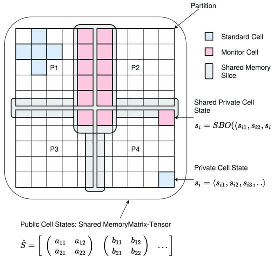 Each sub-partition σi containing a number n of entities can primarily use private memory for the state variables of the entities. Only boundary entities close to another sub-partition/region require shared memory or message-based communication, implementing distributed memory. The first case study in this paper will discuss a sliced memory architecture with shared and non-shared memory segments.