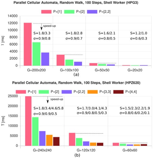 Besides micro-scale simulations, macro-scale simulations, like urban simulations (traffic, migration, segregation, energy supply, etc.) or pandemic simulations that involve a high number of cells or entities, are demanding for parallel and distributed computation due to their high computational complexity [12] and complex long-range communication graphs. An agent-based simulation is another field of parallel computation [13], in contrast to cellular automata (CA), with short-range entity–entity communication (data dependency) that is suitable for parallel decomposition, with nearly linear scaling in terms of the problem size and number of processors. Multi-agent systems can be characterized by long-range communication, limiting the scaling up and achievable speeding-up significantly and limiting the efficient distribution of computation, but domain-specific partition and communication restrictions can relax this limitation. The first case study evaluated in this paper applies spatial world partitioning for the parallel processing of a CA. A partitioning scheme commonly relies on a shared or distributed memory model. Simulation including Multi-agent Systems (MAS) can exploit data-path (shared-memory) parallelism, using GPGPU acceleration and control-path parallelism with network clusters equally [13]. The hardware acceleration of agent-based simulation, using GPGPU and accelerated processing units (APU), is still an ongoing research field [14].
