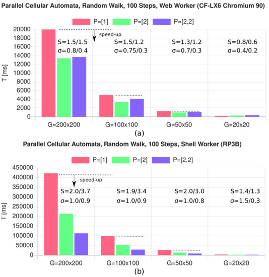 Two different dominant parameters were identified in [3] that have a significant impact on the speed of parallel systems: (1) the memory model (shared memory vs. distributed memory, memory architecture, cache hierarchy, bandwidth, etc.); (2) the granularity of the parallel tasks on a data- and control-path level, as well as the parallel execution time, compared with the overhead (setup and communication). For example, the start-up time of a JS VM using WorkShell code can consume up to one second (see Section 8.1 for details). The third, less dominant parameter is the communication load and communication architecture. Communication introduces synchronization, and synchronization introduces temporal sequential processing that reduces the degree of parallelism that can be achieved.
