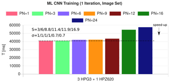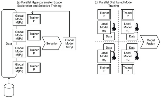 - Dynamic. The problem size grows with an increasing number of processing nodes and computational processes. An example is multi-model ML training. Each processing node trains an independent model with different parameter variables from the set V = {vi}i, including random variables (Monte Carlo simulation), either using the same input data D or different input data D1, …, Du, or sub-sets di ∈ D, i.e.: ⟨D,v1⟩ → f1, …, ⟨D,vn⟩ → fn. The aim of parallelization is ideally a constant computational time, with an increasing number of parallel processes (scaling is S = 1), or at least, growth lower than PN = |P|, i.e., 1 < S < PN.