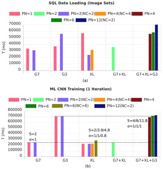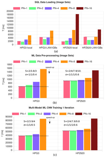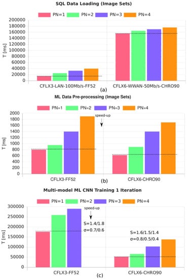 The architecture of data input-output streams, as part of the communication infrastructure of parallel and distributed systems, has a significant impact on scaling- and speeding up. Memory-in-place methodologies are only suitable for parallel systems using shared memory architectures. Distributed memory should be organized and the communication overhead must be considered carefully. Databases can provide the necessary organization of data. In this work, a set of relational SQL databases is used; however, SQL databases do not scale linearly with increasing data volume and complexity. It is difficult to distribute the partial content of databases. Typically, NoSQL databases are chosen for large-scale cloud computing and data-mining tasks [23]. Temporal databases are suitable for the processing of latent temporal data streams and large amounts of temporary data. The SQL database was chosen here because of its lightweight implementation, SQLite, which can be embedded efficiently in any application program, even in a web browser using transpiling technologies. SQLite provides an advanced cache algorithm that reduces file access significantly in distributed computations like multi-model ML (reading the same input data multiple times).