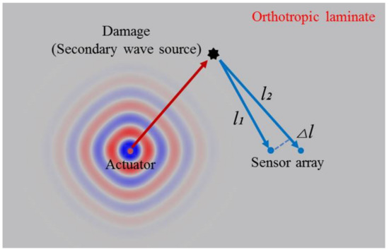 The schematic diagram of the phase-reversal method process is presented in Figure 1. In the process of damage imaging based on an ultrasonic guided wave, the guided wave propagates through the structure and interacts with the damage, where the damage can be regarded as a secondary wave source. Therefore, damage localization can be realized by analyzing the scattering wave from the defect. As shown in Figure 1, in phase-reversal imaging theory, sensor arrays with narrow spacing are used for detecting the scattering waves. For each pair of the sensors, the wave velocity of the damage-scattering wave propagating from the damage source to each receiving array element is considered the same within the margin of error, so the anisotropy of composite materials does not affect the phase-reversal method. By using the Fourier transform, the phase spectrum of the damage scattering signal at a pair of sensors can be obtained as follows: