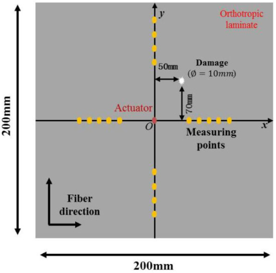 The size of the experimental plate was 800 mm × 800 mm, and its thickness was 1 mm. The information on material parameters was unknown, which confirmed the advantage of the proposed method, i.e., that it does not require prior information on material parameters. The damage forms of a composite plate structure usually include cracks, fiber fracture, debonding, and delamination. To facilitate the extraction of scattered signals and reduce the difficulty of subsequent signal processing, the damage was replaced by a circular magnet with a diameter of 10 mm, whose positional coordinates were 50 mm and 70 mm, and which was pasted on the front and back of the plate. The measurement points were two linear arrays on the x-axis and y-axis; the quantities and positions are given in Table 3.