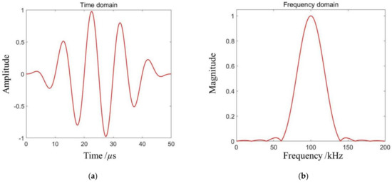 where is the amplitude of excitation signal, is the center frequency which was chosen 100 kHz, is the time duration, and is the wave period which was chosen 5 in this study. The time domain and frequency domain of the excitation signal are shown in Figure 3.