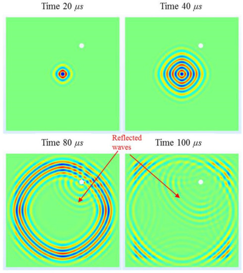 The wave field diagram of the orthotropic composite material plate obtained by the finite element calculation is displayed in Figure 4. As the orthotropic characteristics of the composite material led to the directional dependence of the guided wave’s propagation velocity, the wave front has an approximately diamond shape.