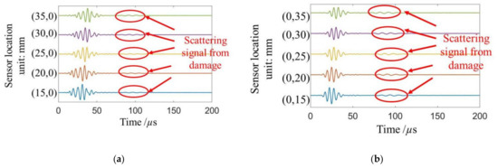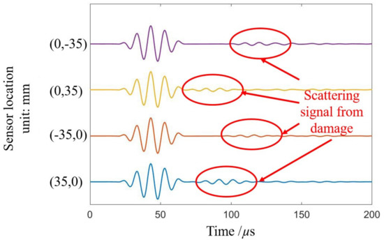 Four orthogonal linear sensors located on the coordinate axis were used to receive the damage scattering signals. The position and number of sensors are shown in Table 2. According to the theory of PRM, the spacing of sensors should meet the error requirements, and in this study, the sensors’ spacing was set to 1 mm. Off-plane displacement signals of each measuring point were extracted, and signals of four typical measuring points are shown in Figure 5, where direct wave signals and damage-scattered wave signals can be clearly identified.