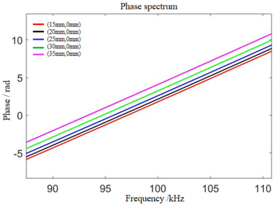 Since the damage was located in the first quadrant, the signals of forward points on the x-axis and y-axis were selected for phase reversal damage detection. The phase corresponding to the frequencies in the frequency band near the center frequency of the damage scattering signal on the x-axis is shown in Figure 6. The phase was obtained by the Fourier transform, and the frequency interval was 5 kHz. As shown in Figure 6, the phase difference between the scattered signals obtained by different sensors was different.