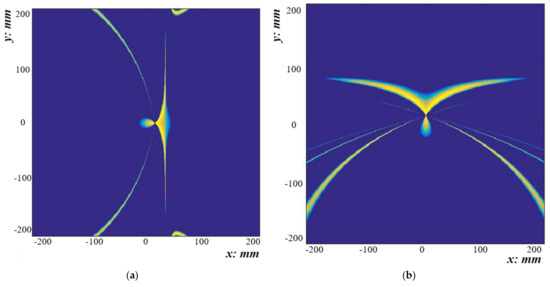 The imaging results in Figure 7 show the geometric characteristics of the phase-reversal method. Specifically, the imaging result obtained by the linear receiving arrays in the same direction formed a hyperbola, which passed through the damage. By applying the proposed data-fusion method, the imaging matrices were obtained by Equation (9), and they were overlapping, but the corresponding curves met at the damage position. According to Equation (9), the imaging matrices shown in Figure 7 were superimposed and fused, and the imaging curves obtained from measuring points in different directions will intersect at the damage area. At this time, multiplying the superimposed imaging matrices can eliminate the phase artifacts, noise artifacts, and distortion caused by the change of the external environment and the dependence of wave velocity and wavelength on frequency.