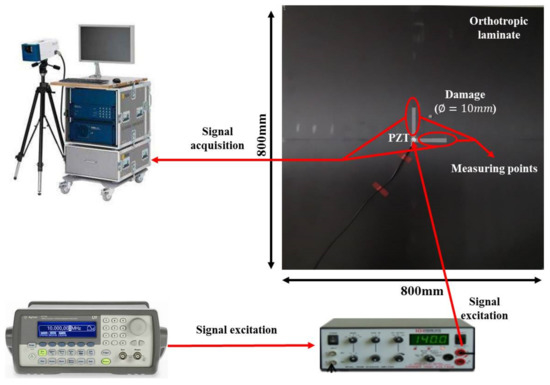 To verify the numerical-simulation results, an experimental platform for damage detection of composite materials based on the phase-reversal method was constructed, as shown in Figure 9. The experimental platform included the orthogonal anisotropic carbon fiber composite laminated plate, which was used as a research object; the signal generator, which was used to generate the signal with a center frequency of 100 kHz; the signal amplifier, which was employed to improve the signal energy; and the Doppler laser vibrometer, which was used to measure the vibration signal of structure.