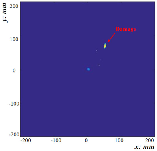 As shown in Figure 8, the imaging results were obtained by the combined addition and multiplication method of the correlation coefficient based on data fusion. The actual damage location coordinates were (50 mm, 70 mm), and the damage location coordinates by PRM and CAMM were (51 mm, 70 mm).