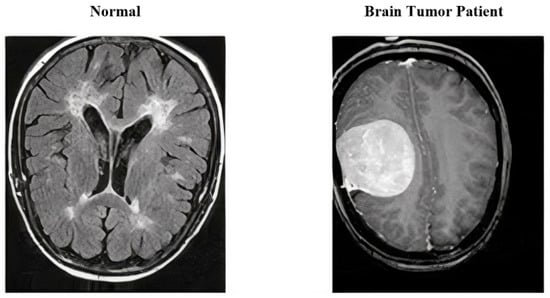 (L) MRI of a person without a brain tumor and (R) MRI of a person with a brain tumor.