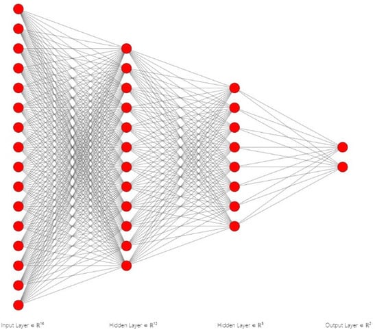 Figure 2 shows the connection of ANN layers with each other in the order from left to right in a layer-wise manner, {16, 12, 8, 2}. The input layer consists of 16 nodes, and they are attached with two hidden layers having nodes, 12 and 8. The output layer consists of two nodes. A person will either suffer from a tumor or not. Thus, it is a binary classification and the Softmax function comes into play in the output layer, which helps to sum up the values to 1.