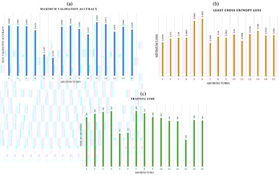 (a) Maximum validation accuracy of each CNN model, (b) least validation cross-entropy loss of each CNN model, and (c) training time (in seconds) of the CNN model.
