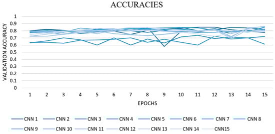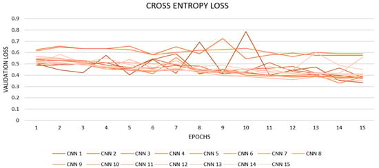 Table 2 contains all the information regarding all 15 different CNNs with their MVA, LVCEL, and TT in seconds. Figure 5 shows the MVA, LVCEL and TT for each architecture. Figure 6 shows the validation accuracy, and Figure 7 depicts the validation loss of each CNN model for each epoch. In Table 2, we notice that architecture 4 had the lowest OFV of 0.6073. This might be due to batch normalization, as it reduces training time. We also observed a directly proportional connection between the training time and our different CNN architectures. As in architectures 5, 6, and 13, we fed image sizes of (64, 64) according to which training time was reduced drastically. Hence, we can claim that training time is highly dependent upon IS. Earlier, as we mentioned, TT (Figure 5c) changed drastically when there was an increase or decrease in architecture size, i.e., when we expanded or reduced the layers of CNN and ANN or applied different parameters. According to Table 2, it can also be observed that there is no drastic change in the MVA and LVCEL. However, the maximum OFV of 1.84 was achieved by the 13th CNN architecture, and the minimum OFV was scored by the 4th model as 0.6073. Therefore, we can finally conclude that the simple architecture performed better and was more stable and accurate. For further consideration, architecture 13 was considered an optimal CNN model to diagnose and classify brain tumors.