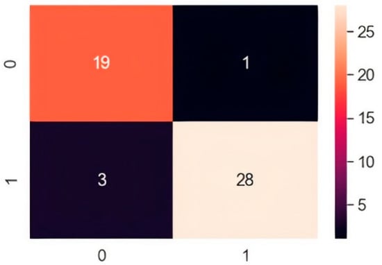 The confusion matrix for architecture 13. We can observe that true positive = 28, true negative = 19, false positive = 3, and false negative = 1.