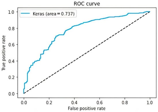 From Equations (6)–(8), we calculated , and . Our model performed outstandingly, as all the metrics were above 90%. Therefore, we can claim that our architecture performed excellently in diagnosing brain tumors. Figure 9 shows the AUC-ROC where the area under the curve was found to be 0.737, which was good.