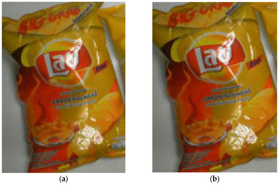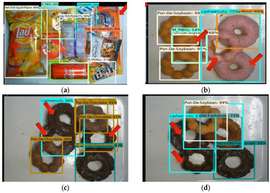 The results for the original algorithm are compared to those for the proposed algorithm using images that contain objects that the original algorithm fails to detect. In Table 8, the left column shows the detection result for a faster R-CNN [4] and the right column shows the detection result for the proposed algorithm: Mask R-CNN with DA and DWT. In sets 1 through 6, the red cross signifies the original algorithm’s failure to recognize objects and the red arrow signifies its X failure to detect objects. The proposed algorithm recognizes and detects all objects. The experimental results show that the proposed technique could be effectively utilized to perform smart stores; using the Snacks database, this study achieved a high detection rate. In the Snacks database, there are a total of 3108 objects, and this work can detect 3099 objects correctly, thus only 9 objects have false detections.