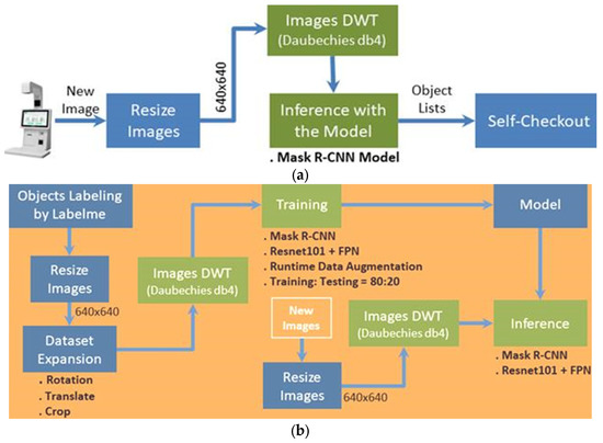 Human–computer interactions (HCIs) use computer technology to manage the interfaces between users and computers. Object detection systems that use convolutional neural networks (CNNs) have been repeatedly improved. Computer vision is also widely applied to multiple specialties. However, self-checkouts operating with a faster region-based convolutional neural network (faster R-CNN) image detection system still feature overlapping and cannot distinguish between the color of objects, so detection is inhibited. This study uses a mask R-CNN with data augmentation (DA) and a discrete wavelet transform (DWT) in lieu of a faster R-CNN to prevent trivial details in images from hindering feature extraction and detection for deep learning (DL). The experiment results show that the proposed algorithm allows more accurate and efficient detection of overlapping and similarly colored objects than a faster R-CNN with ResNet 101, but allows excellent resolution and real-time processing for smart retail stores.