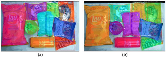 Figure 1 shows a self-checkout platform, which is a proof of concept (POC) developed for smart retail stores. Customers place goods on the base plate and operate the checkout using a touchscreen. The system captures an image of the products using a camera, detects and matches products, and calculates the bill. The effect of different lightings is the challenge most encountered by computer-vision-related tasks. To deal with such a problem, all images used in this research are captured by the self-checkouts, in order to ensure that all images are taken in an environment with stable, defined lightings, as shown in Figure 1. However, this method requires products to be leveled to prevent overlapping [2,3]. Current systems that utilize a faster region-based convolutional neural network (faster R-CNN) [4] and ResNet101 [5] and a pre-trained model that uses the COCO dataset have a mean average precision (mAP) of 95.71%. However, overlapping and failure to distinguish similarly colored objects lead to inadequate detection, so current systems require approximately 2 s to complete a detection, as shown in Figure 2 [2]. This study determines a faster method with a higher mAP detection.