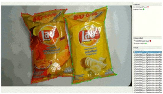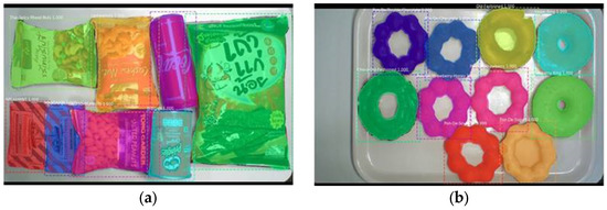 To verify these algorithms for use in smart stores, this study uses the Snacks database, as shown in Table 2, and the open-source annotation tool Lableme as a data marker, as shown in Figure 7. This dataset consists of 23 items: 13 of which are snacks and 10 of which are donuts. After DA, this dataset contains 28,068 images: 22,421 of which are used as training data, 5647 of which form the test data, and 873 of which are used as inference data. The training-data-to-test-data ratio is 8 to 2. DA involves rotation, translation, and cropping, whereby single objects are cropped and background images that contain no object are translated horizontally and vertically. This procedure is performed five times in each direction, so the image of a single object becomes 25 images after translation.